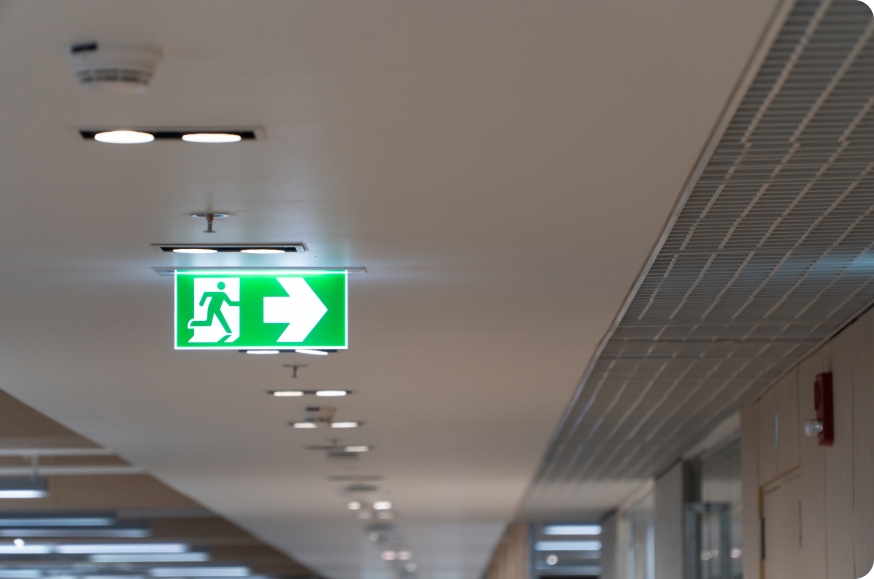 Emergency lighting and exit signage compliant with high-occupancy evacuation requirements.